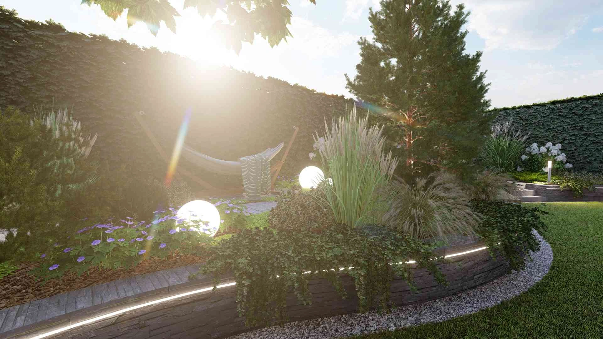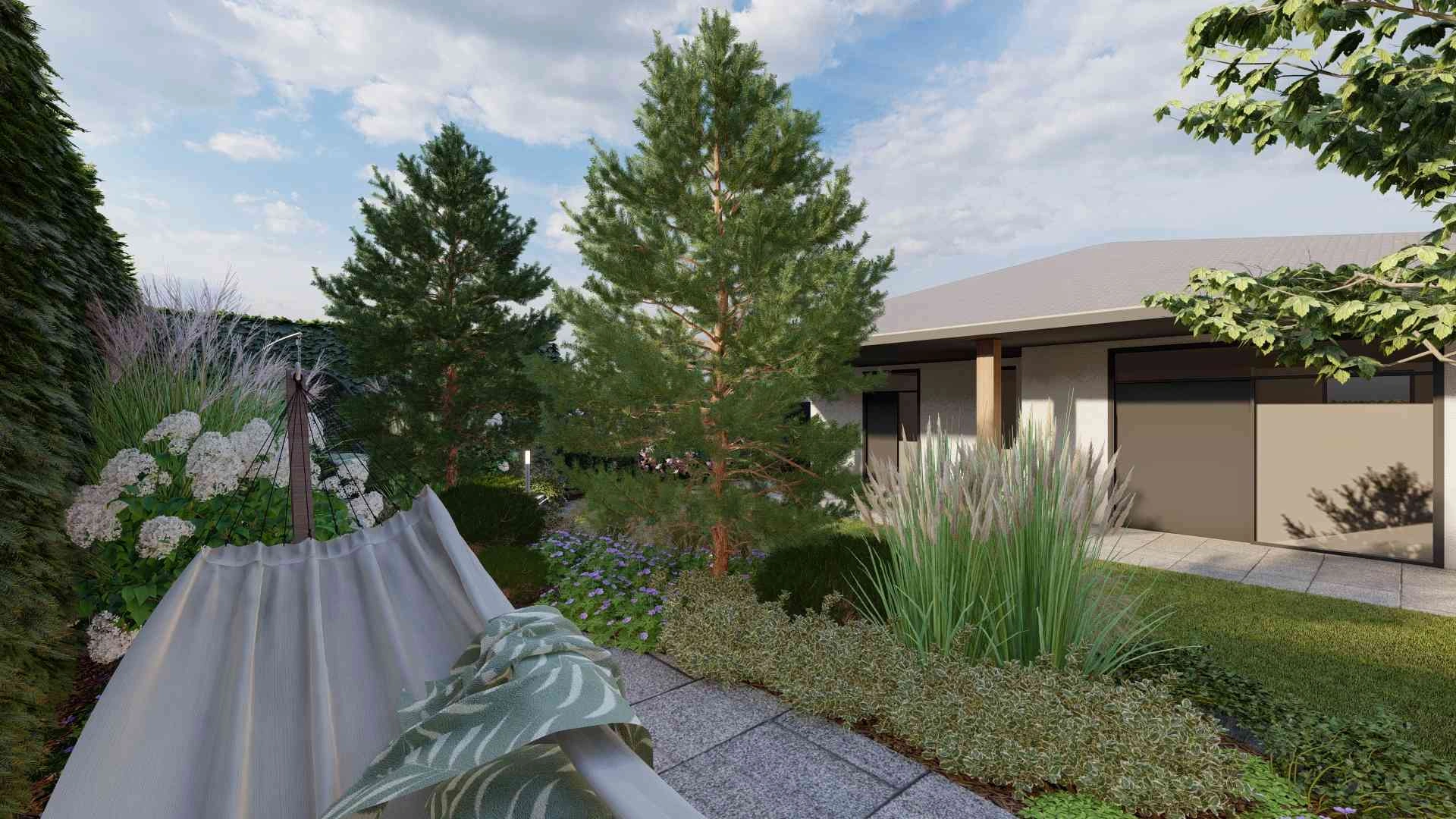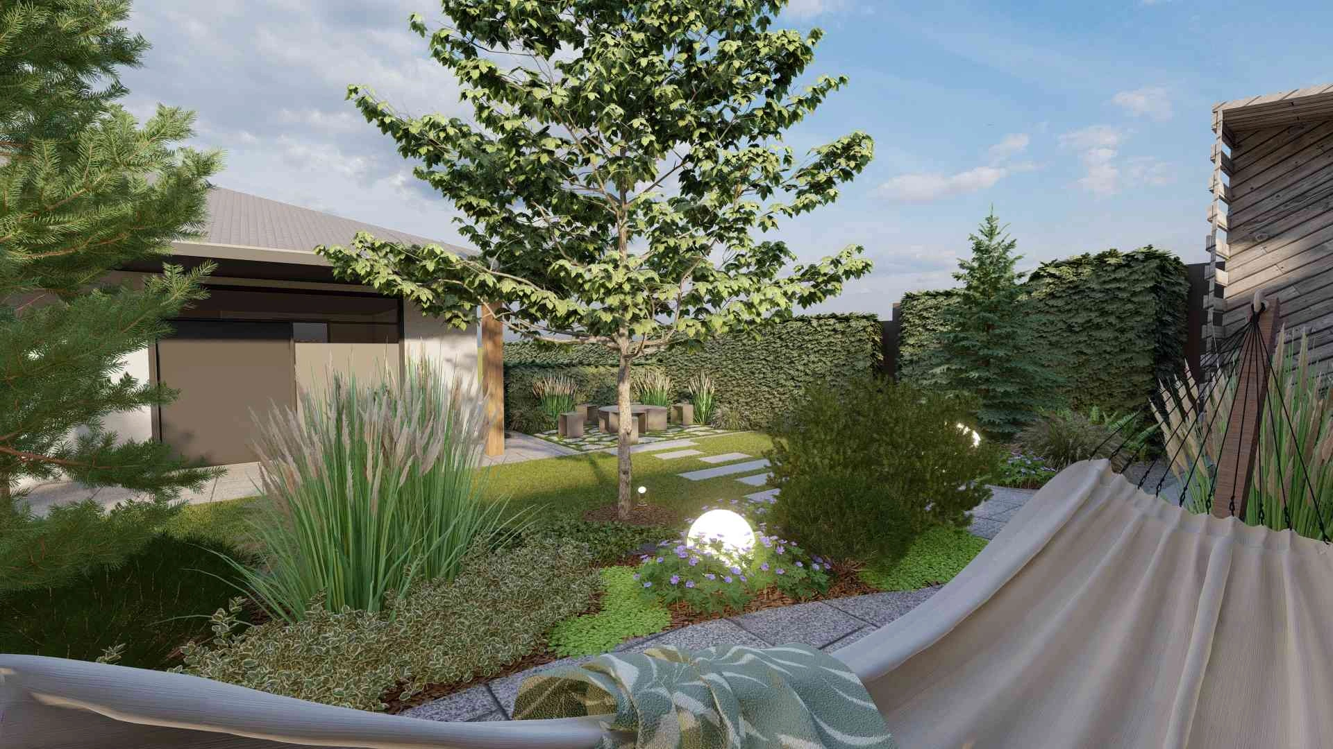 Як результат роботи проєктної групи, ми змогли поділити ділянку на 2 різні за своїм змістом зони: відкрита галявина для ігор з рулонним газоном та затишна зона для усамітнення в тіні дерев.