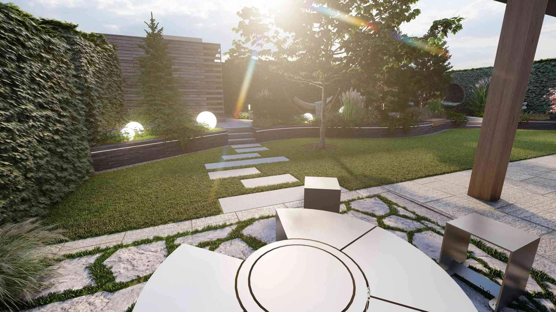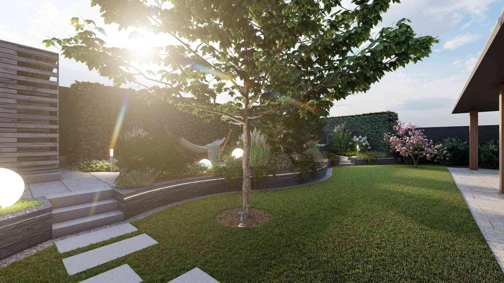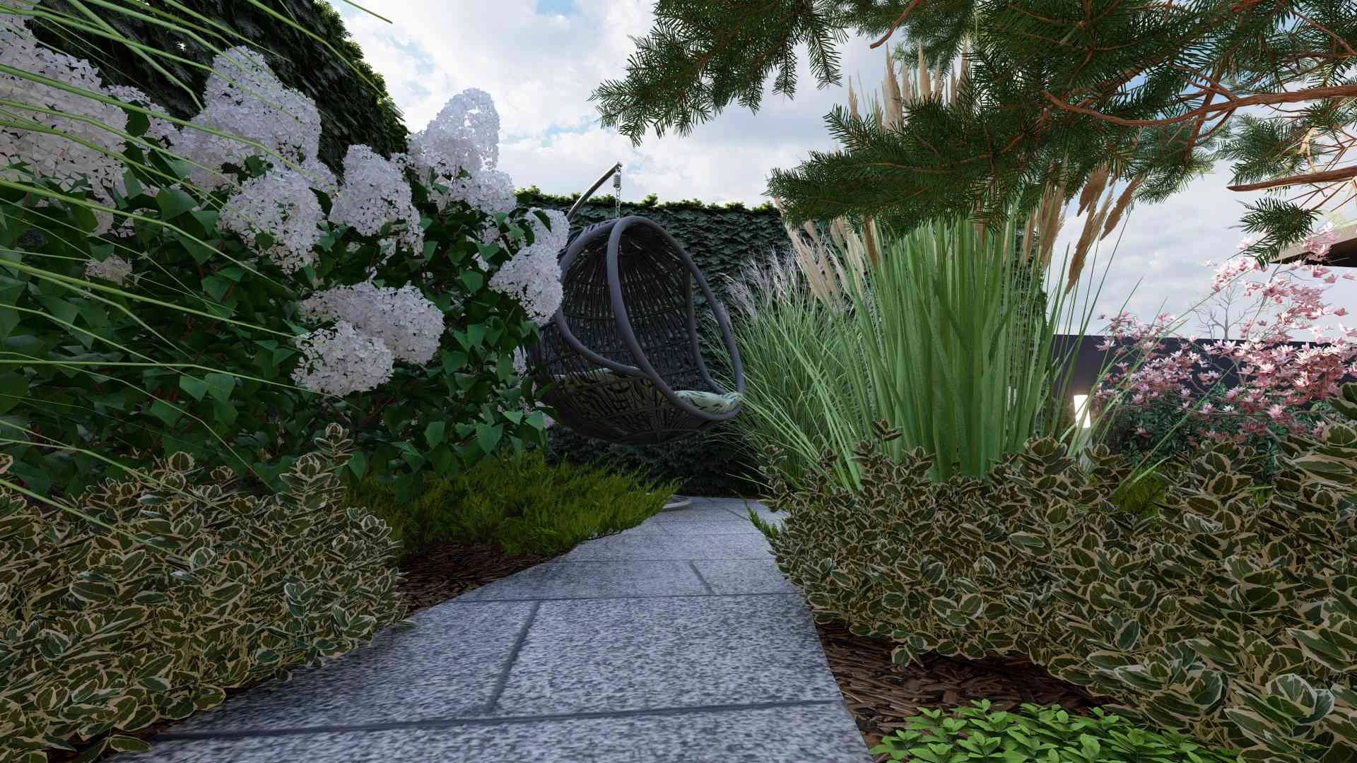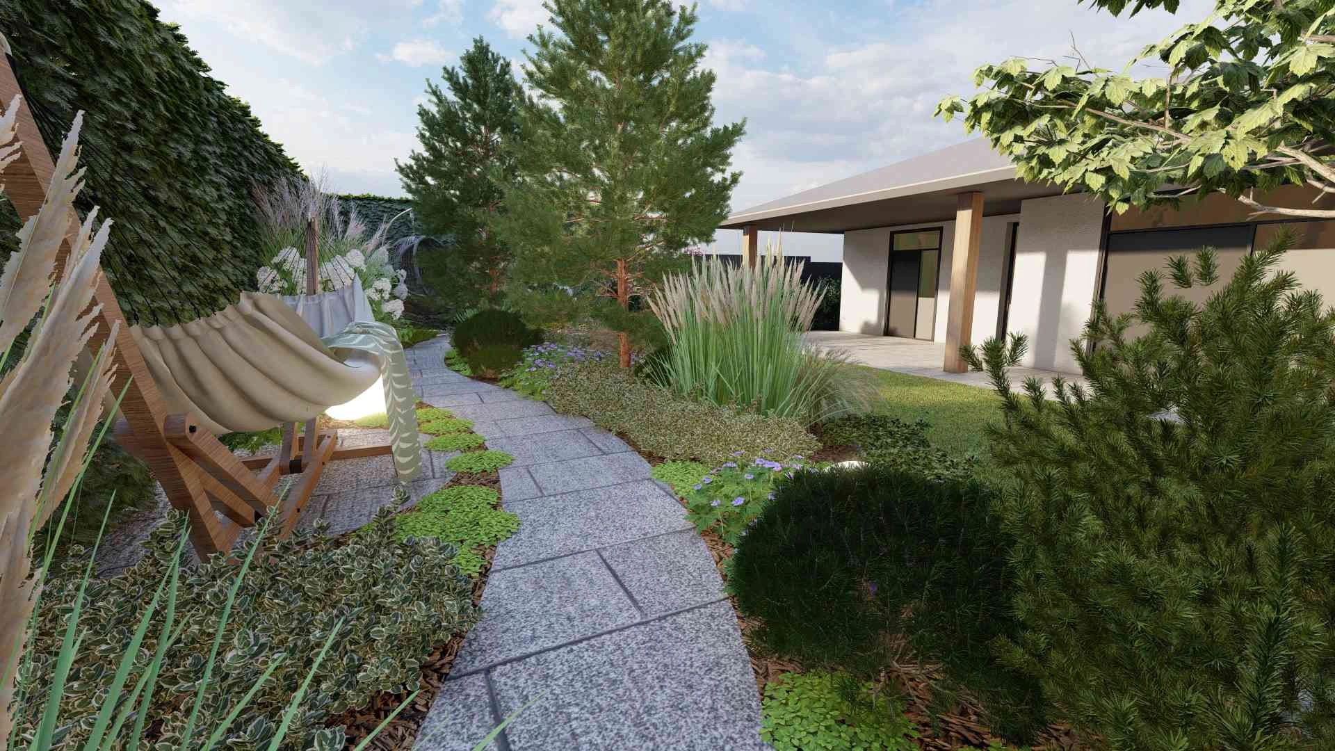 Як результат роботи проєктної групи, ми змогли поділити ділянку на 2 різні за своїм змістом зони: відкрита галявина для ігор з рулонним газоном та затишна зона для усамітнення в тіні дерев.
