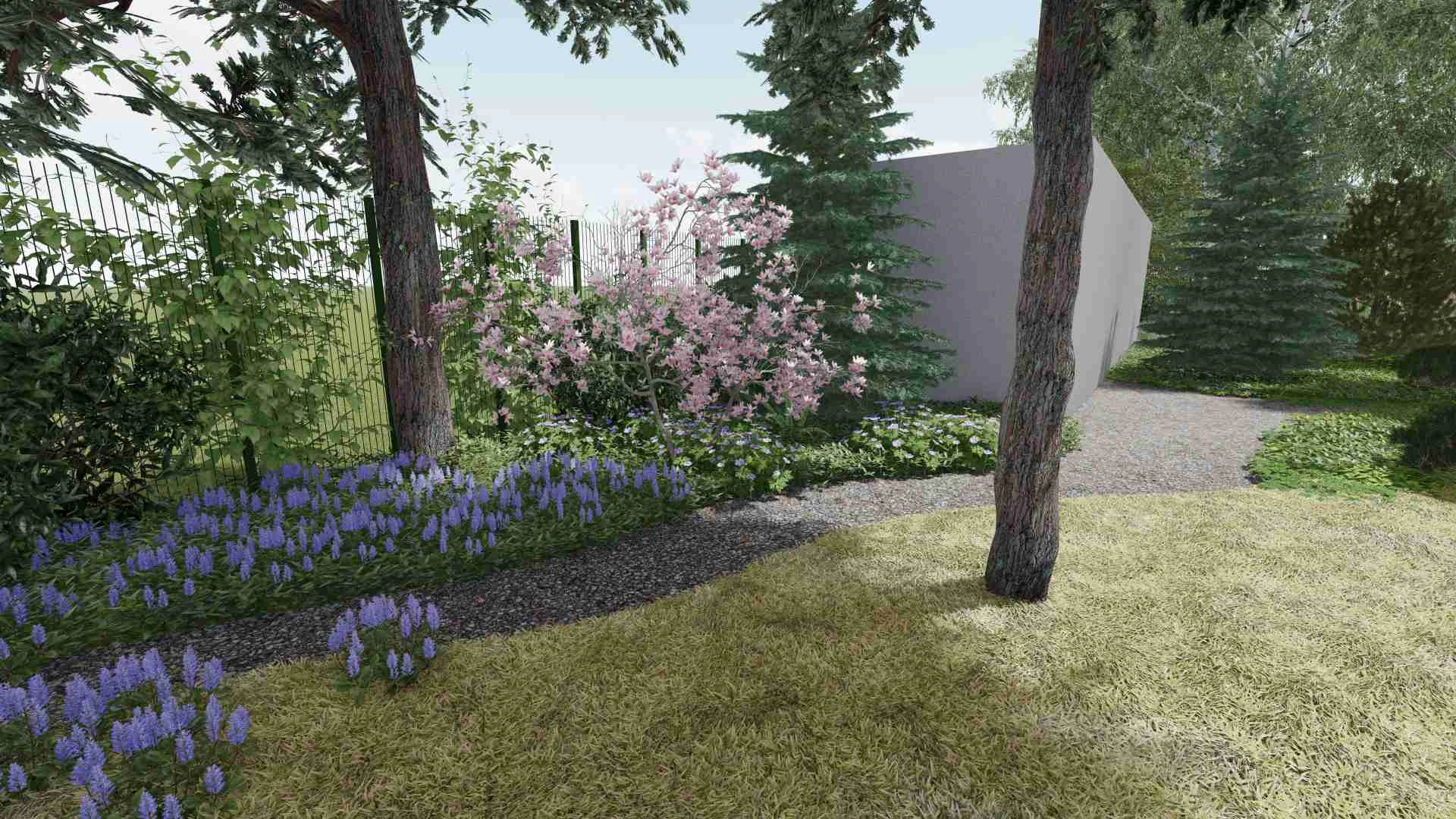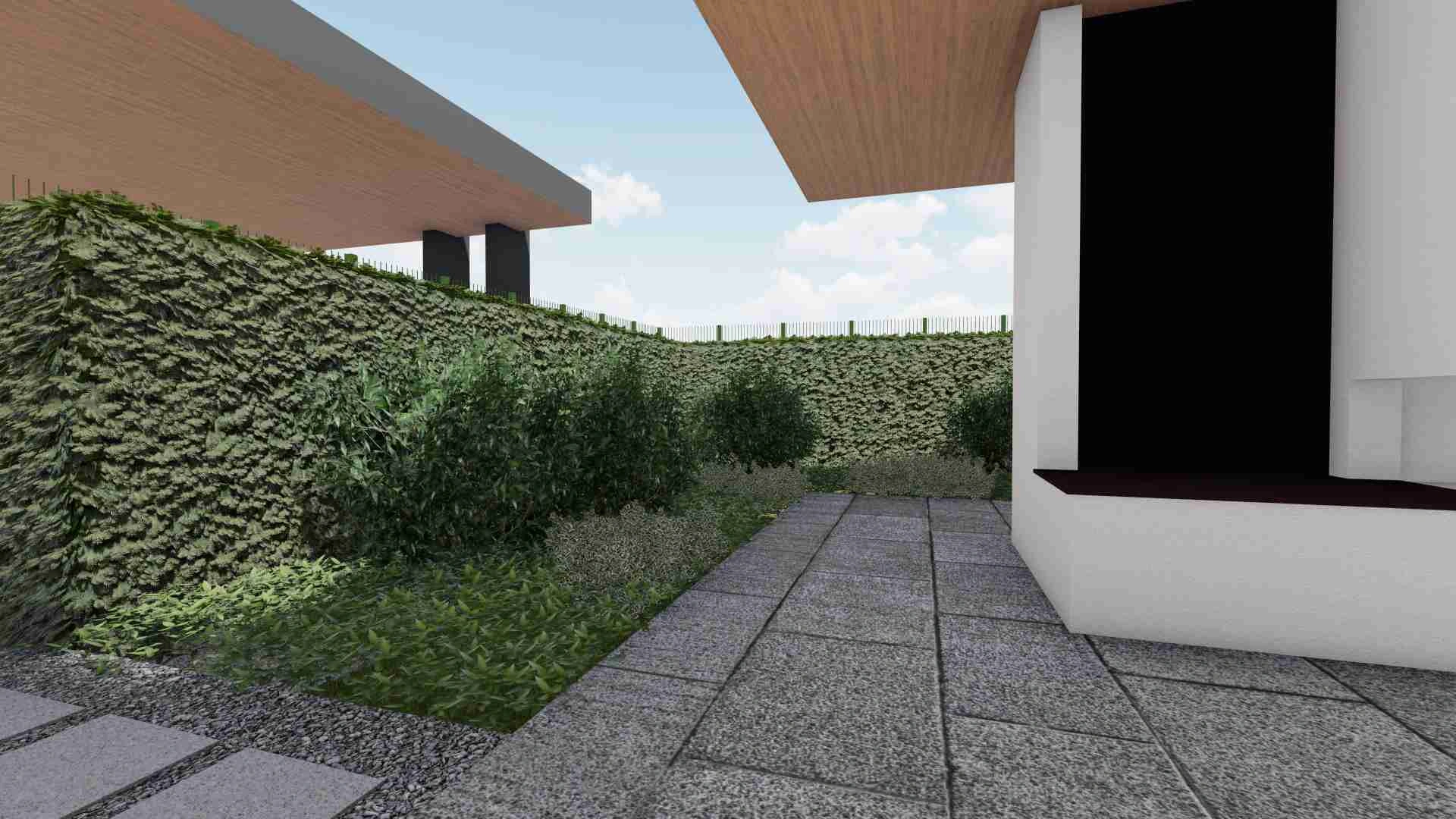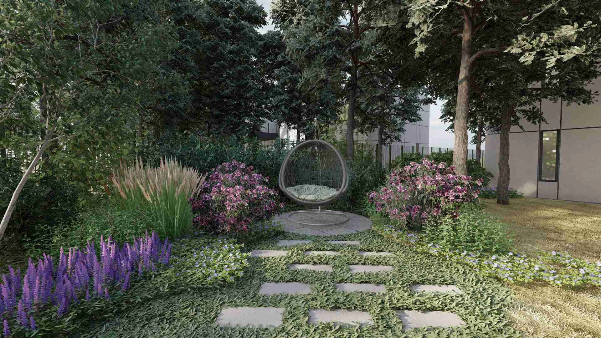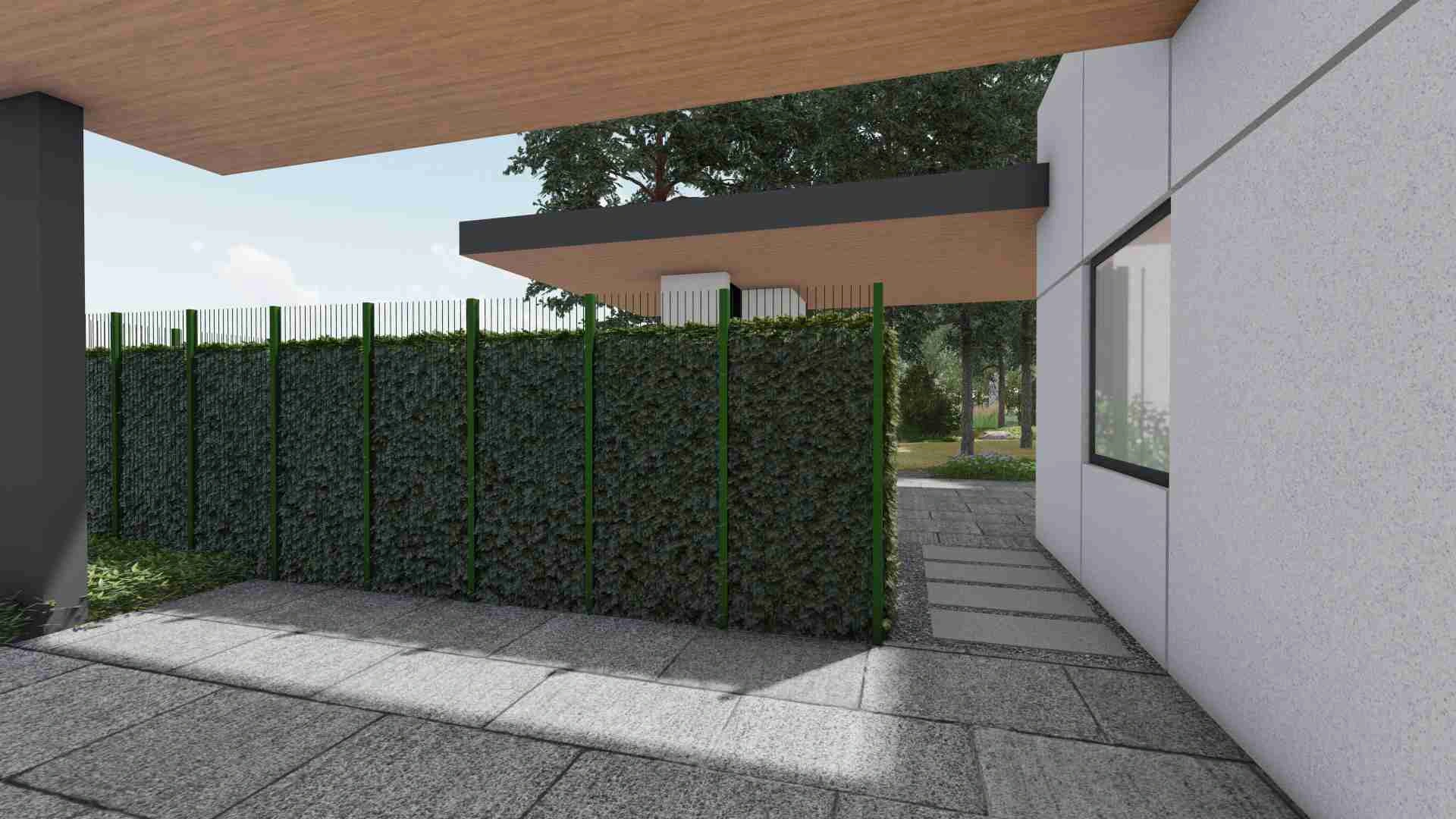 В проєкті не використано жодної туї. Функцію захисту від сторонніх очей забрали на себе кущі середнього ярусу, які разом з тим не створюють непроглядних зарослостей. В критичних місцях був використаний тис ягідний.