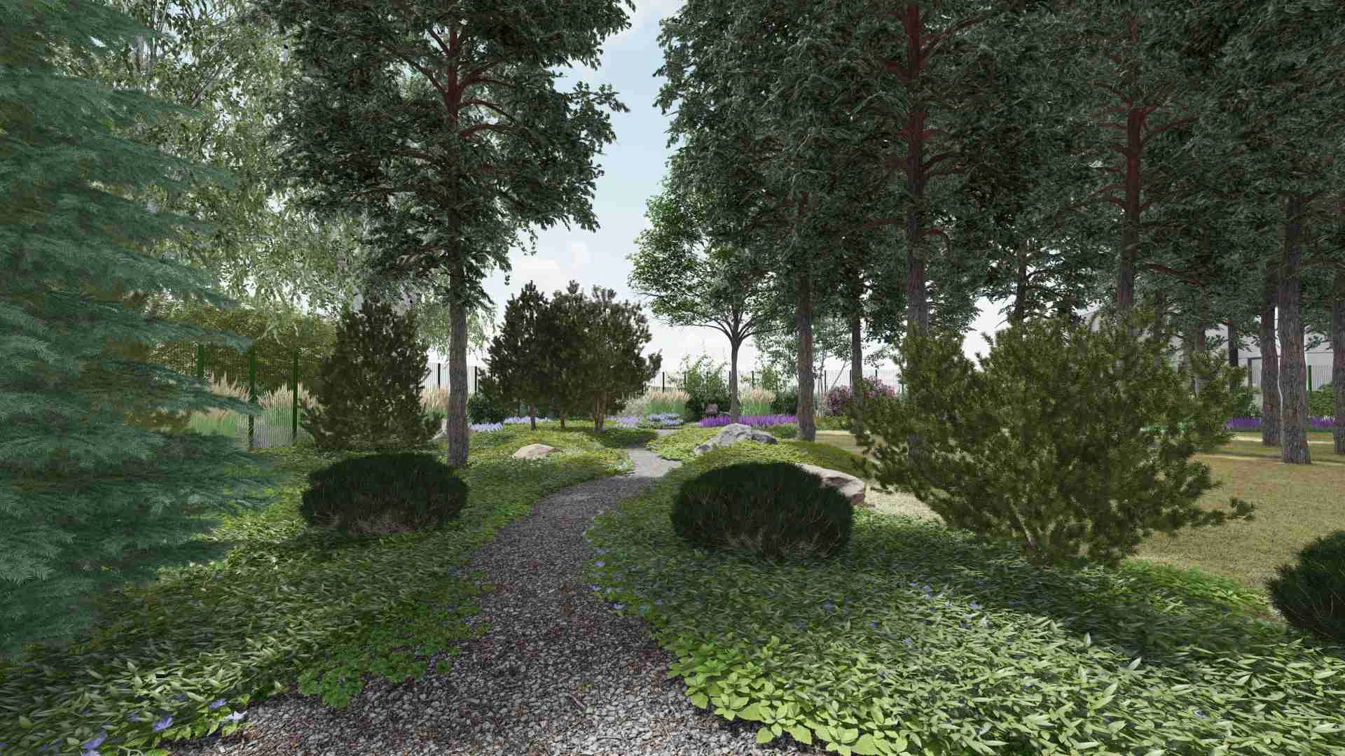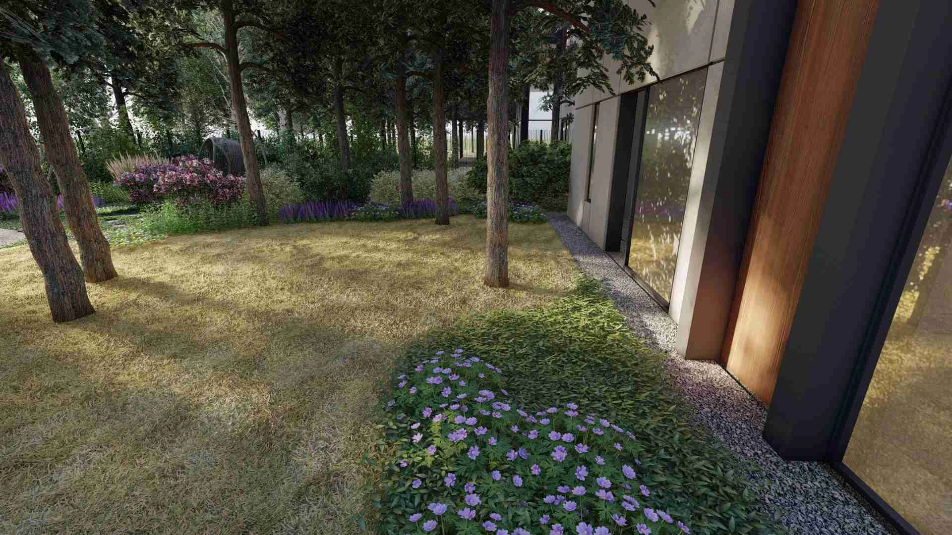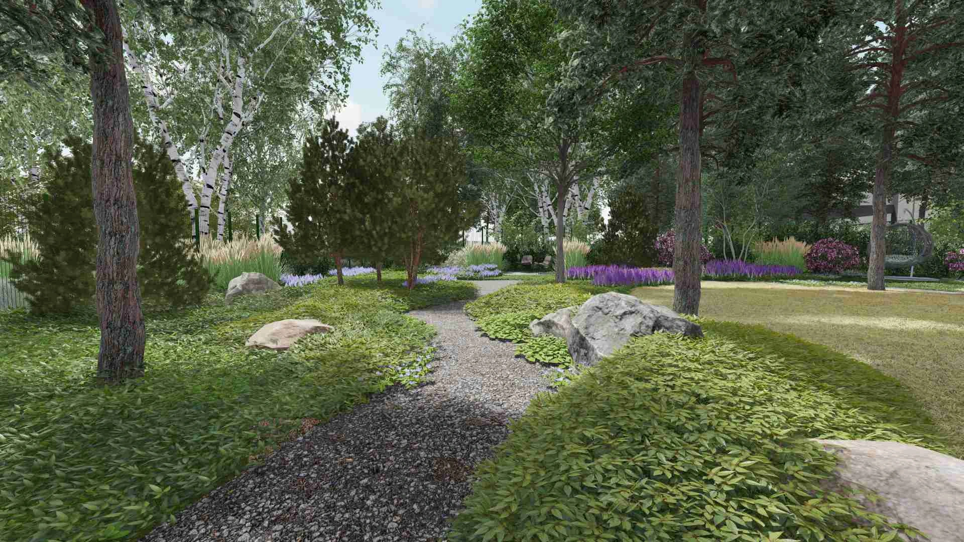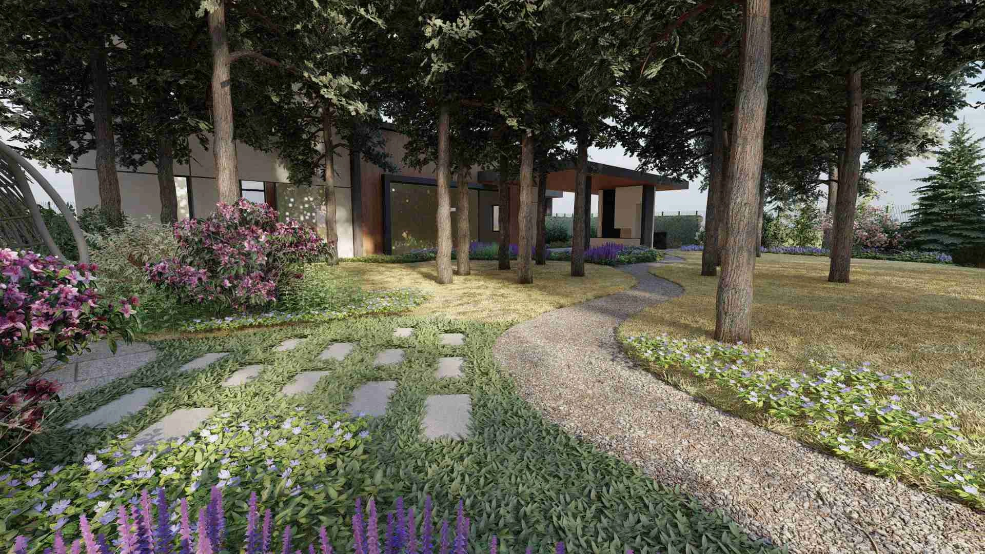 Унікальний проєкт зі збереження хвойного лісу. Без жодного клаптику газону в зоні саду та зі збереженням великої площі хвойного опаду.