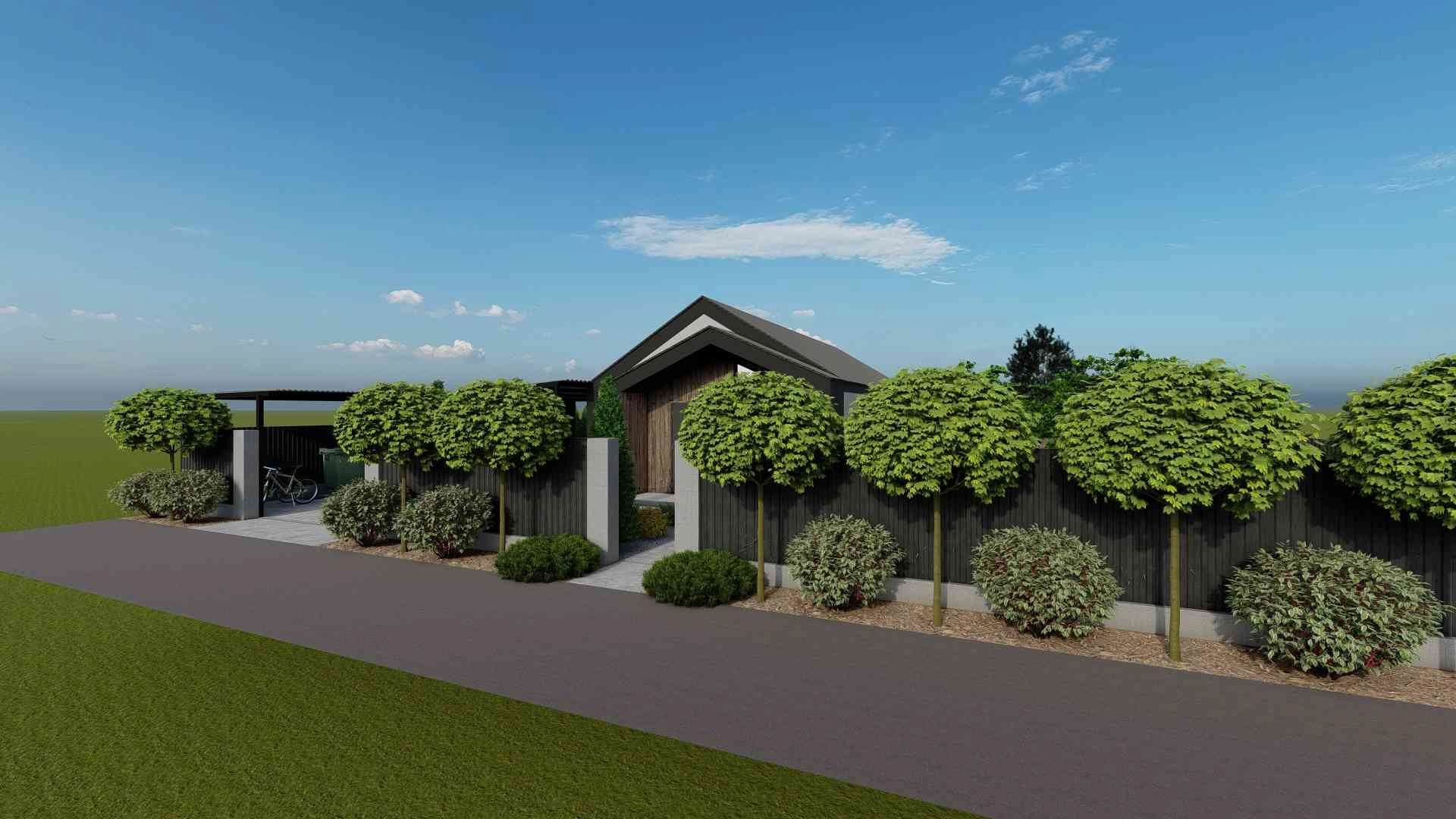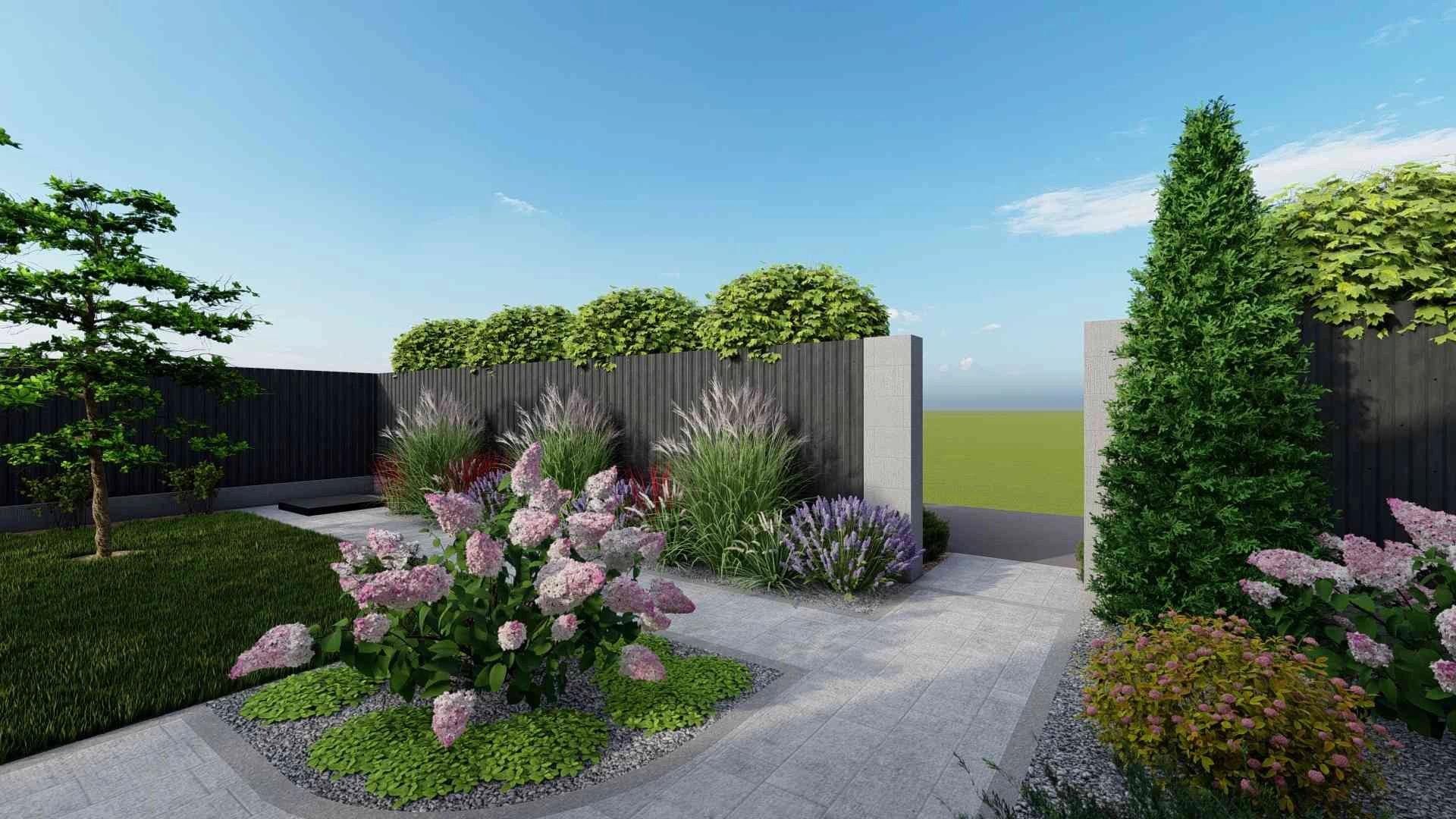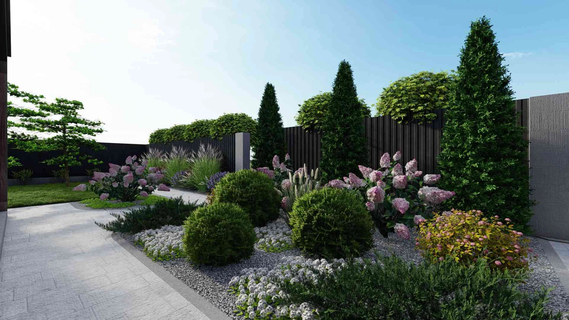 - Входная зона. Сделана чисто декоративной с применением неприхотливых кустов и злаков. На фасадной части высадили клены глобозумы и дерн элегантимима.