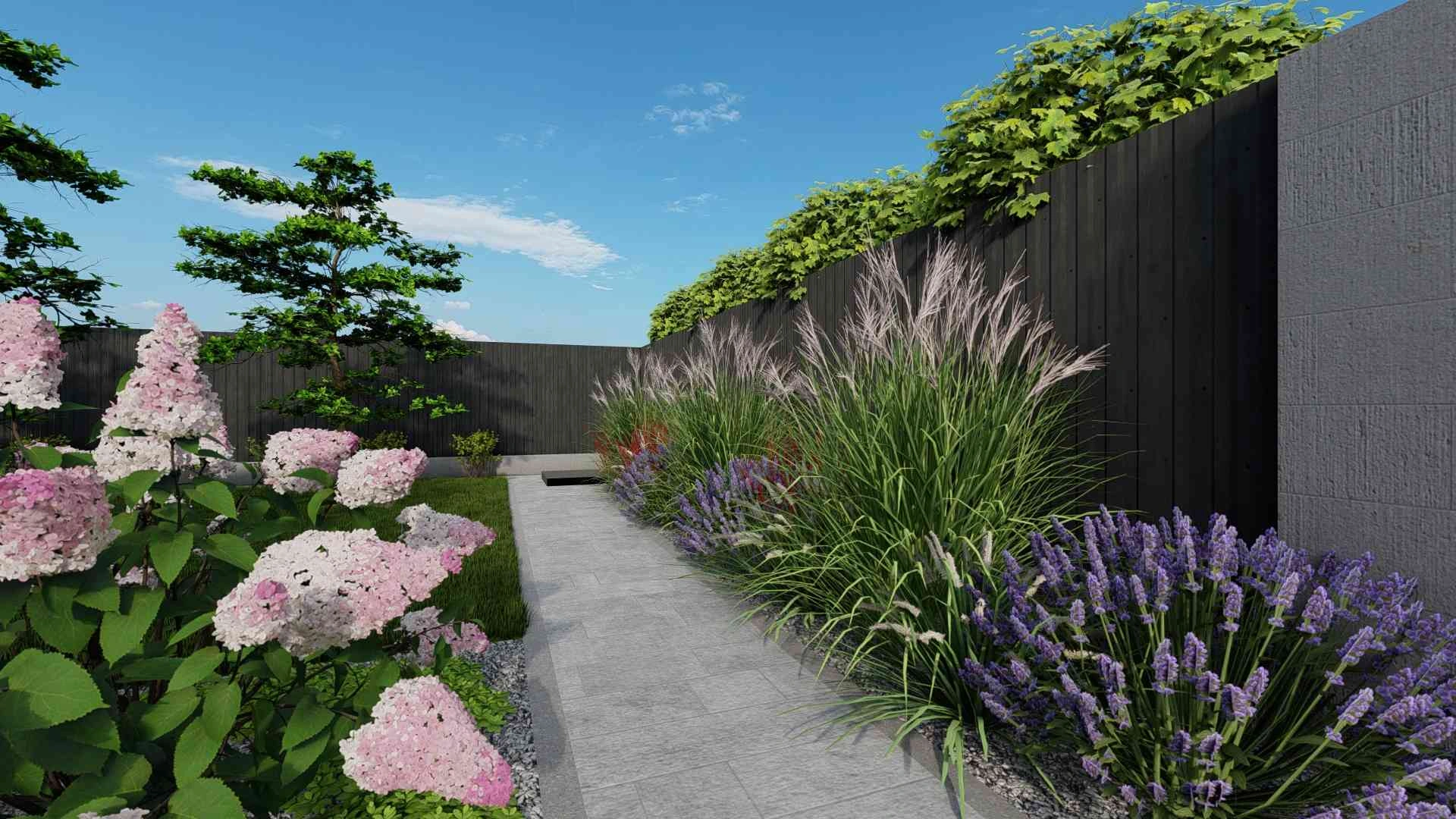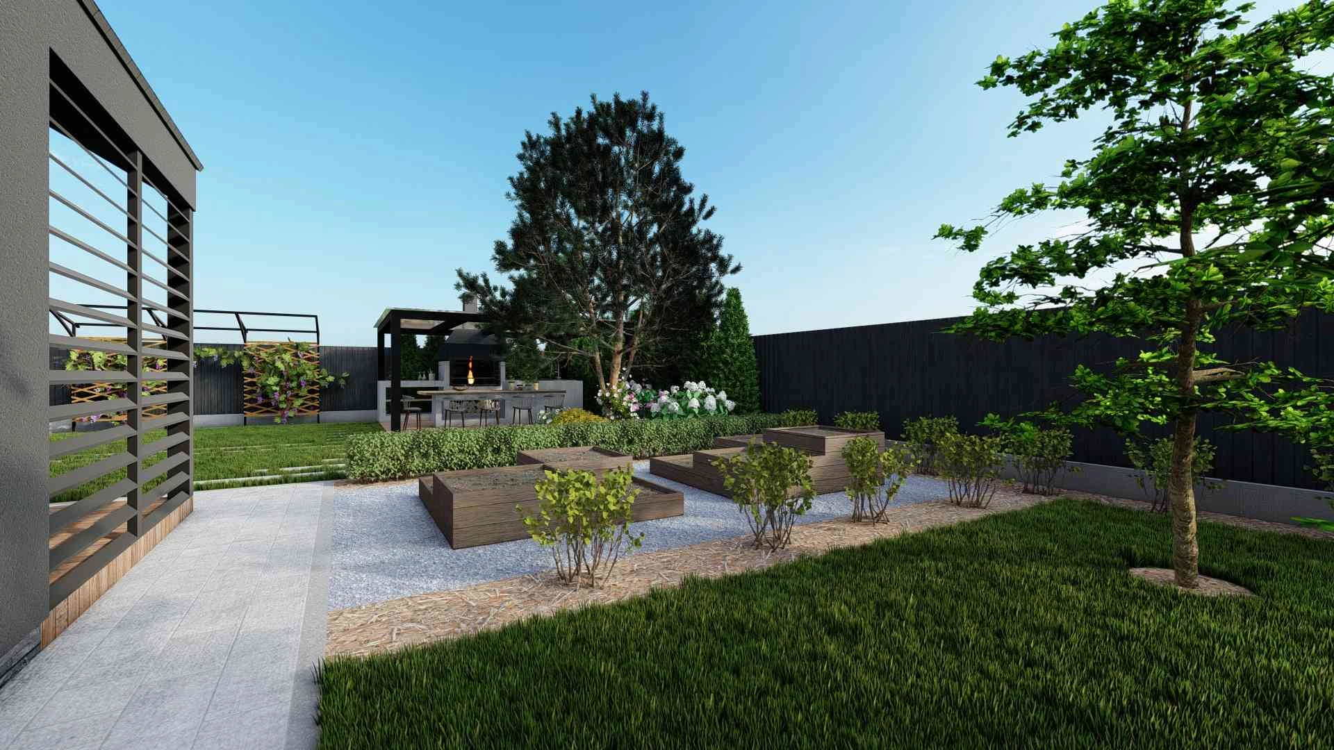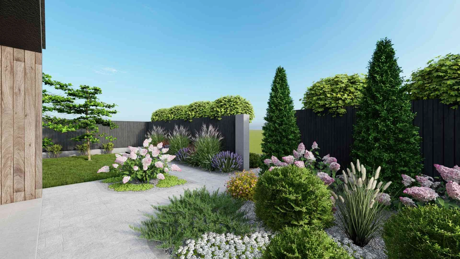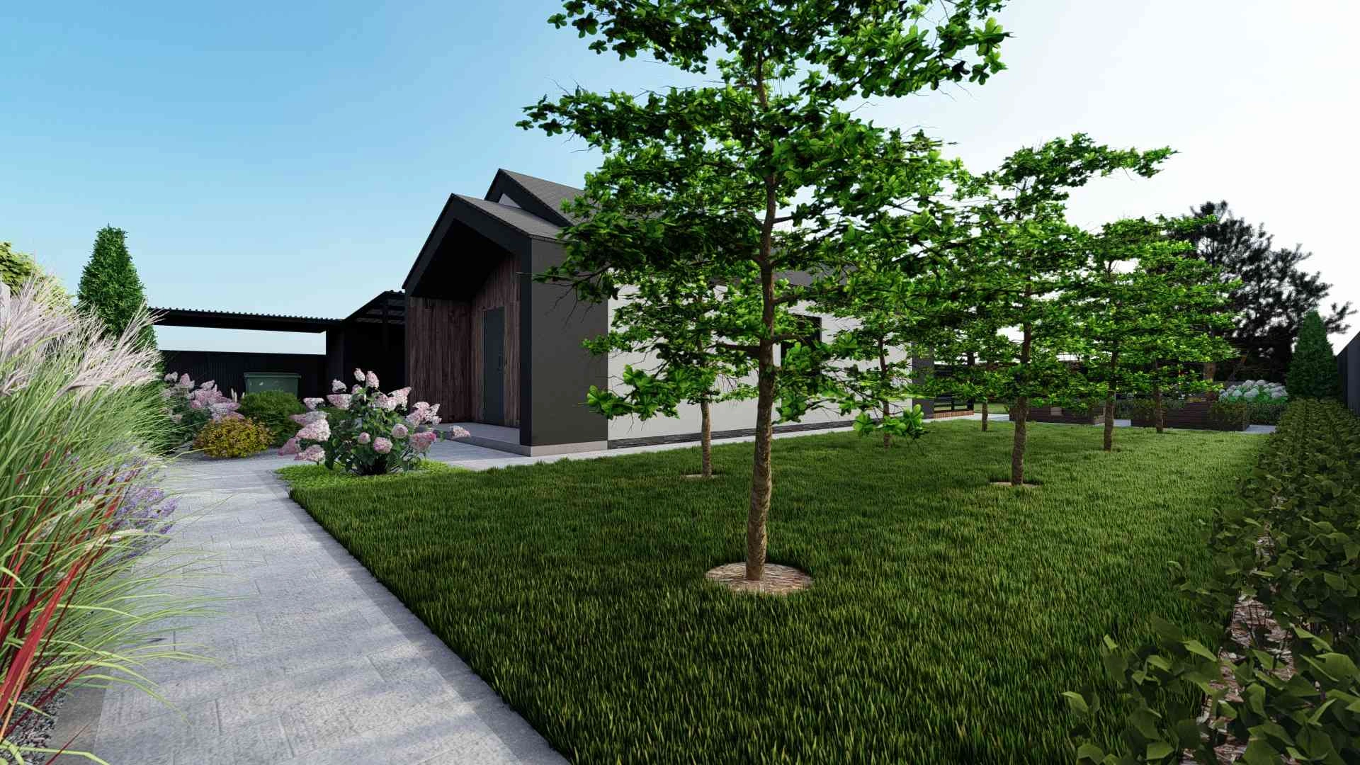 - Входная зона. Сделана чисто декоративной с применением неприхотливых кустов и злаков. На фасадной части высадили клены глобозумы и дерн элегантимима.