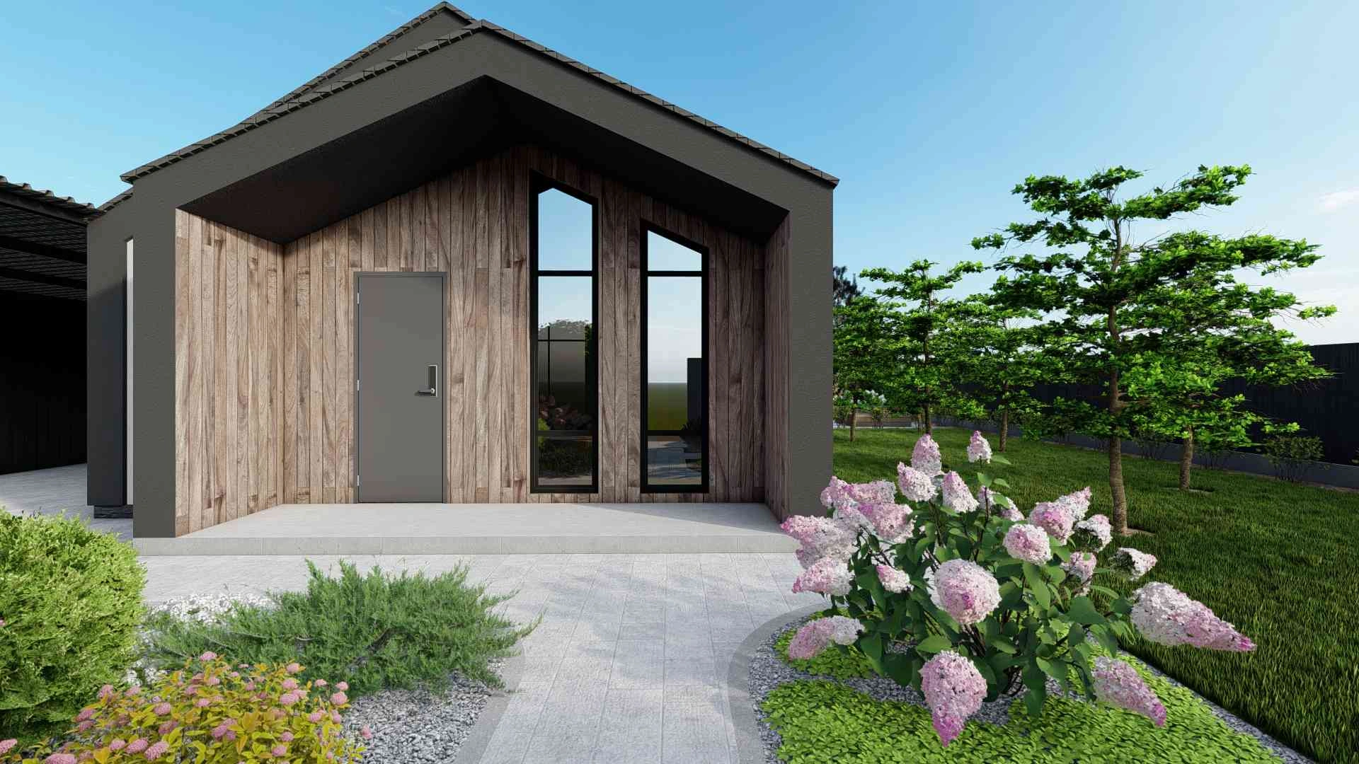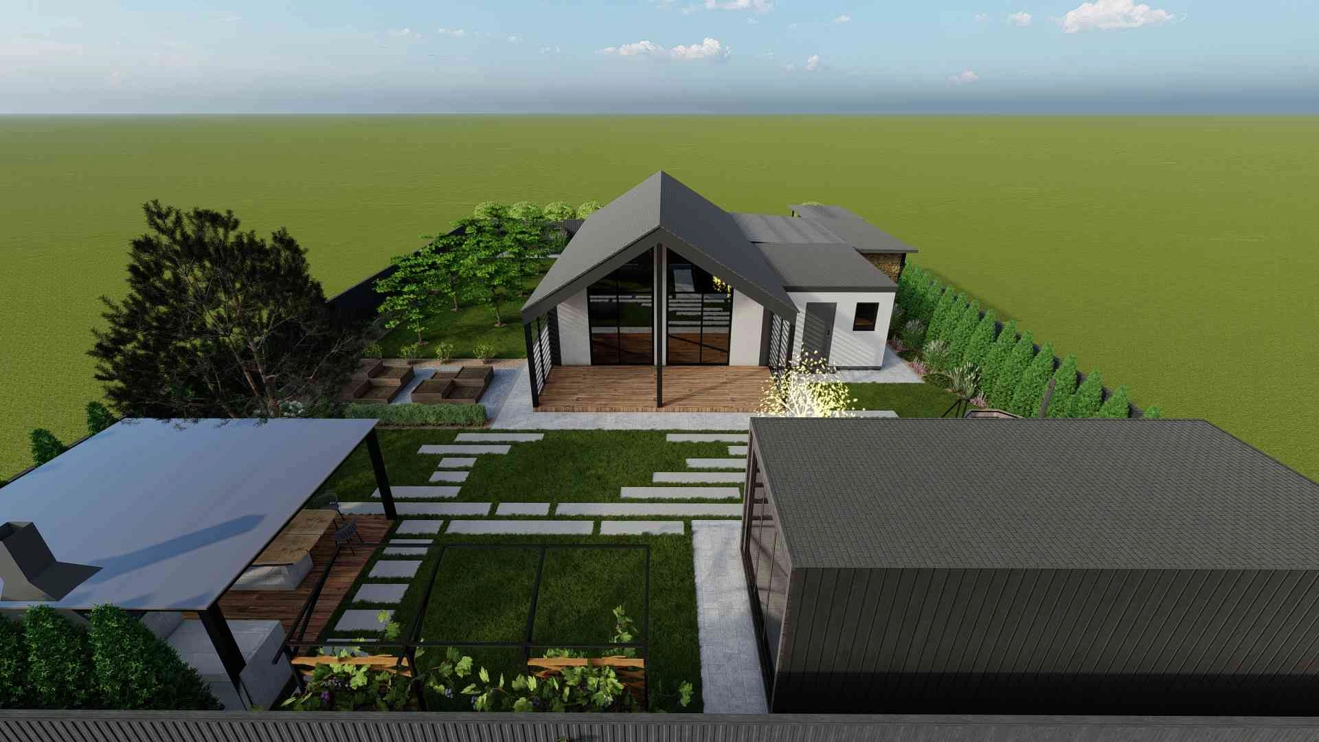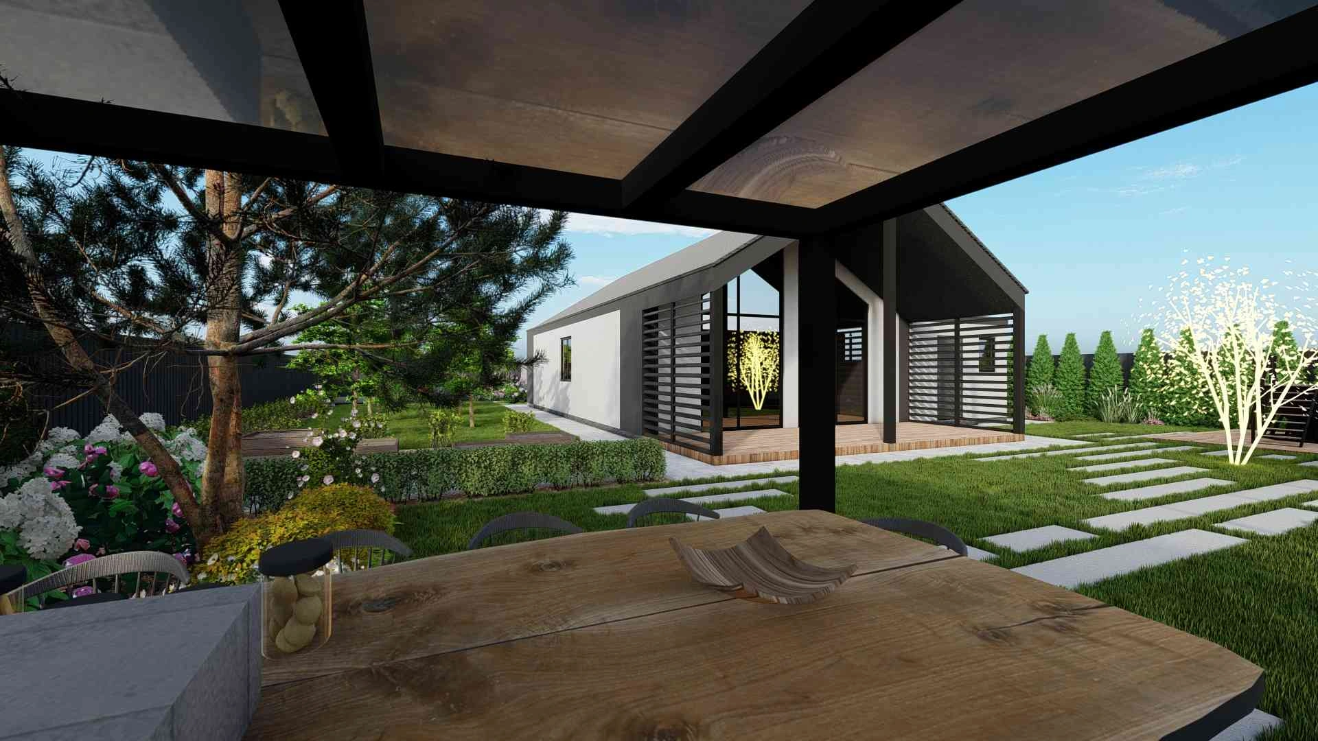 - Навес для авто и хозяйственная зона компактно разместились слева от дома.