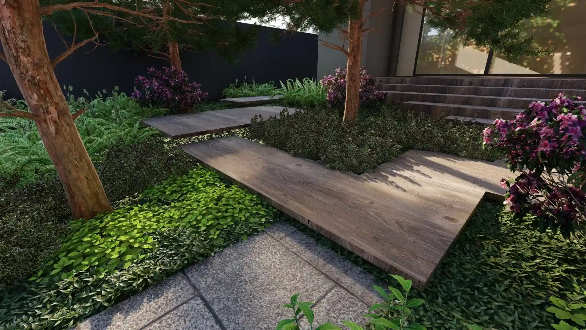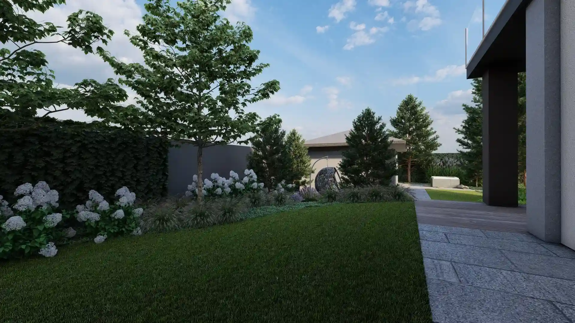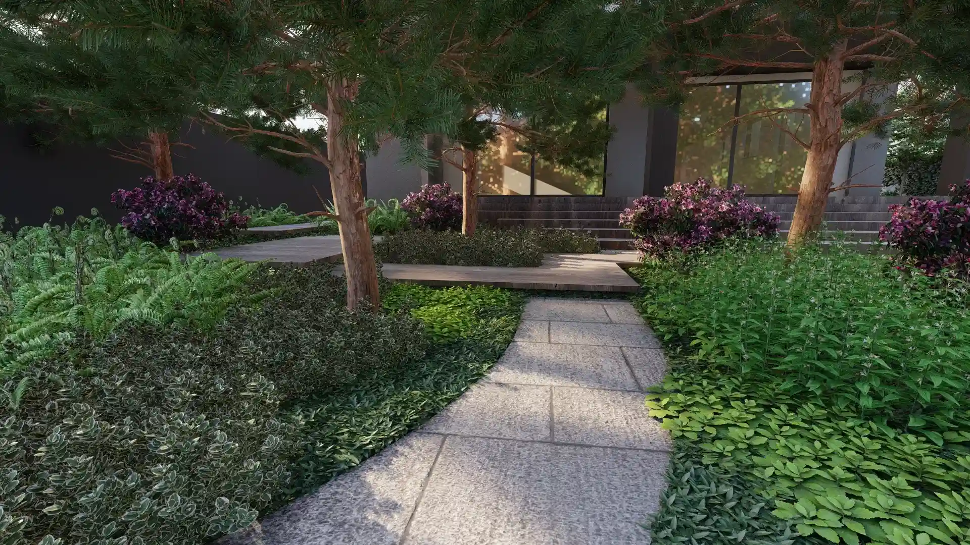 - зона сада имеет наклоны в разные стороны, а чтобы визуально нивелировать это, мы использовали растения разной высоты.