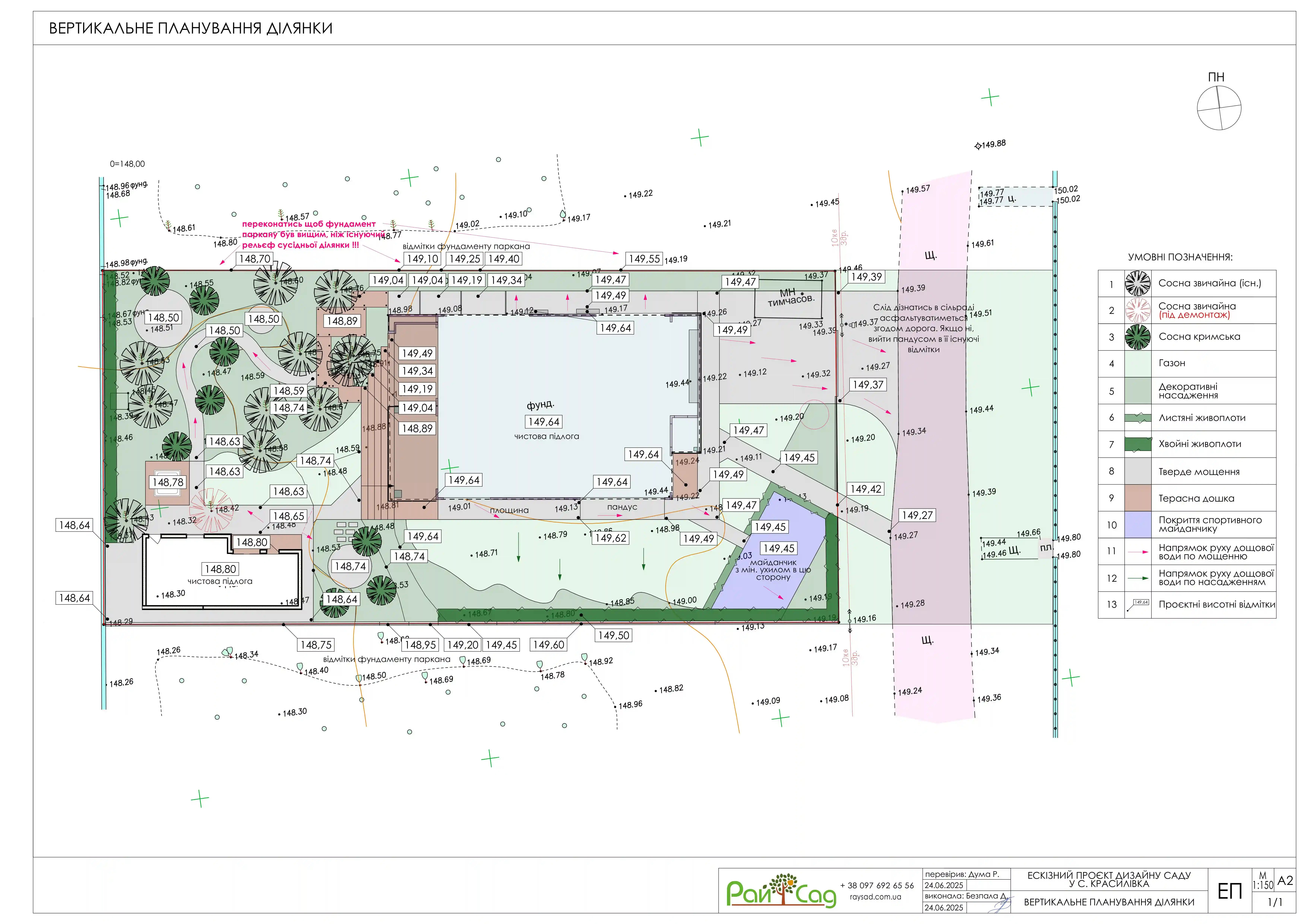 Мы предложили сделать вертикальную планировку участка. Геодезия показала все необходимые нам отметки, но главную "скрипку" сыграл уровень уже построенного фундамента. Он был не логически высок для этого участка.