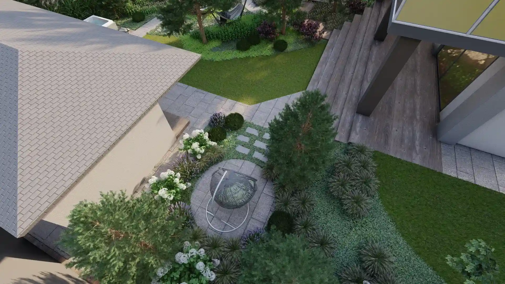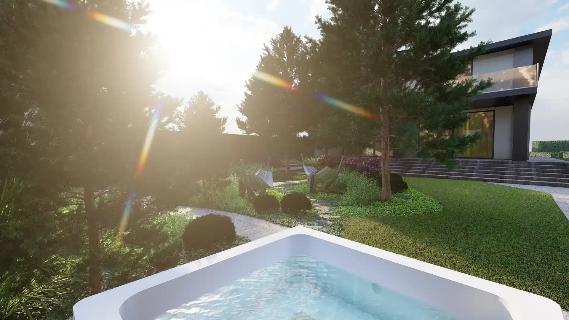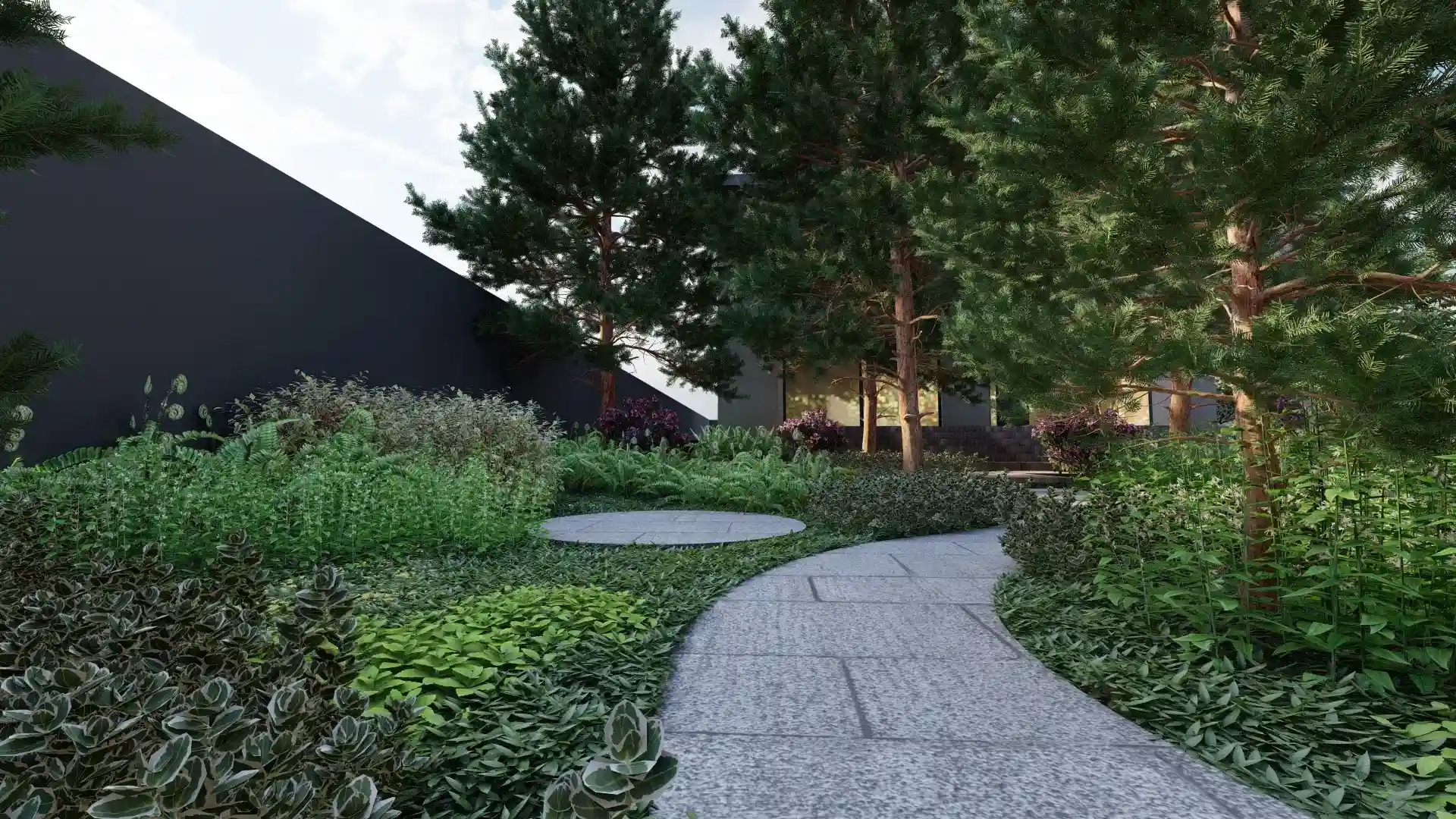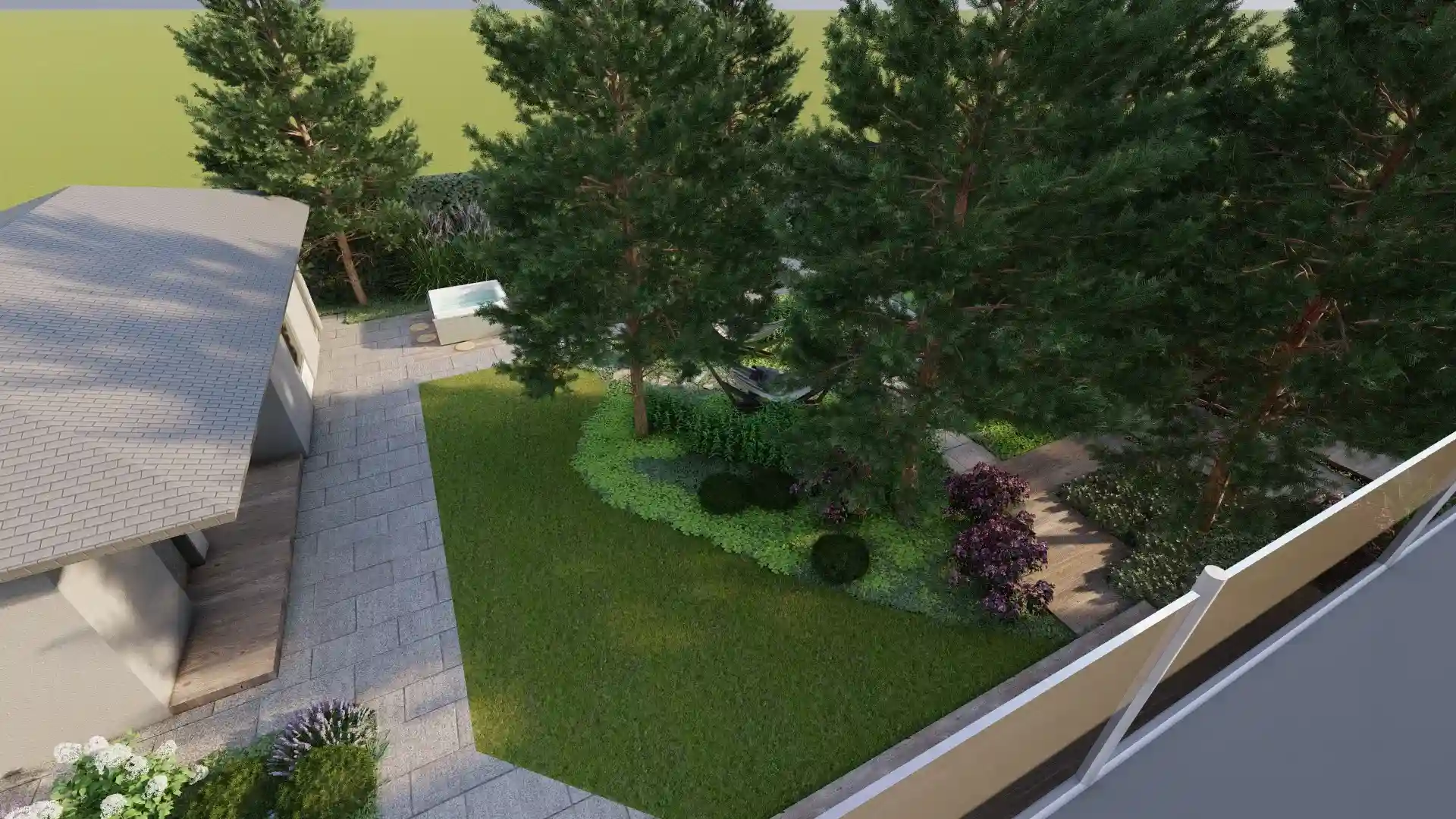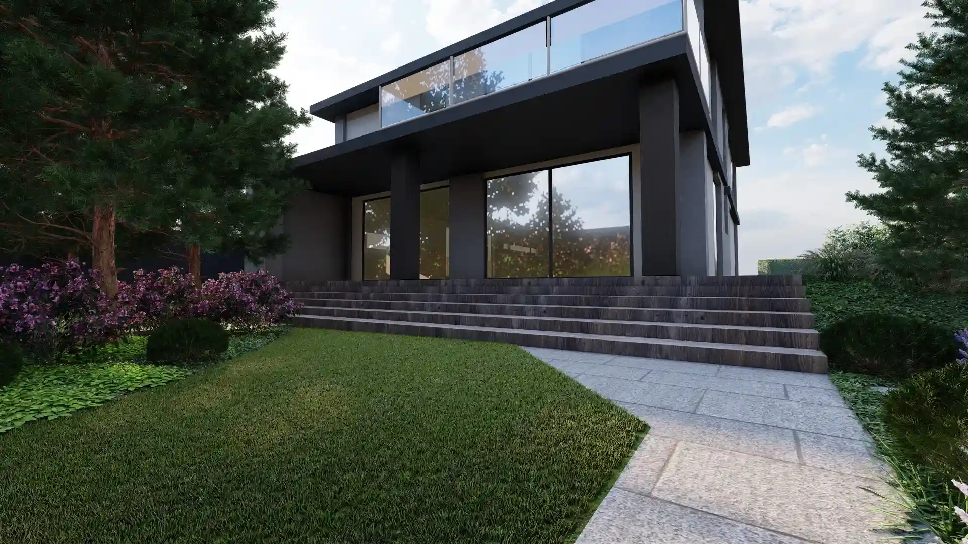 Проект в котором ЗD моделирование стало красивой рамкой для мощной работы по вертикальной планировке, ведь участок имеет перепад высоты в 1 метр в части заднего двора. Нам удалось найти решение, чтобы связать 3 важных элемента: отметка пола дома, баня и существующие замечательные сосны.