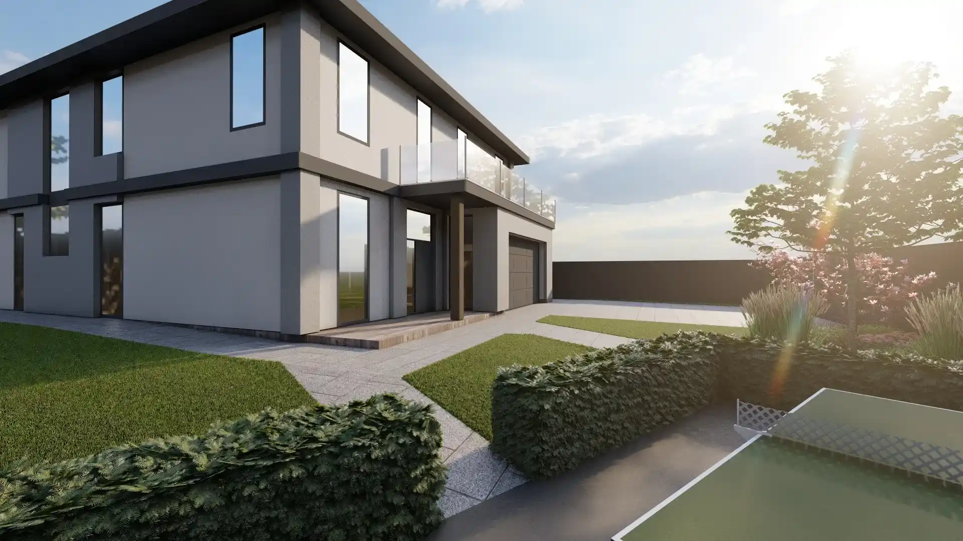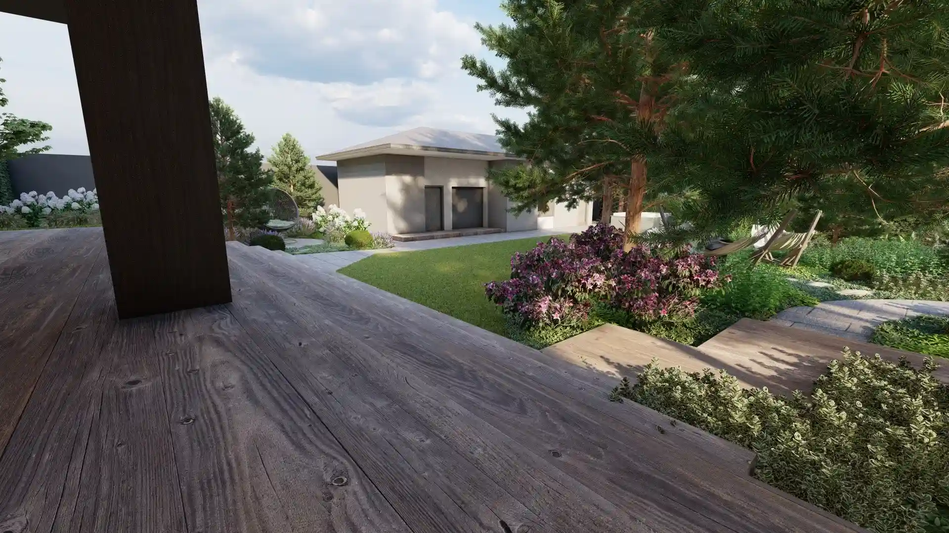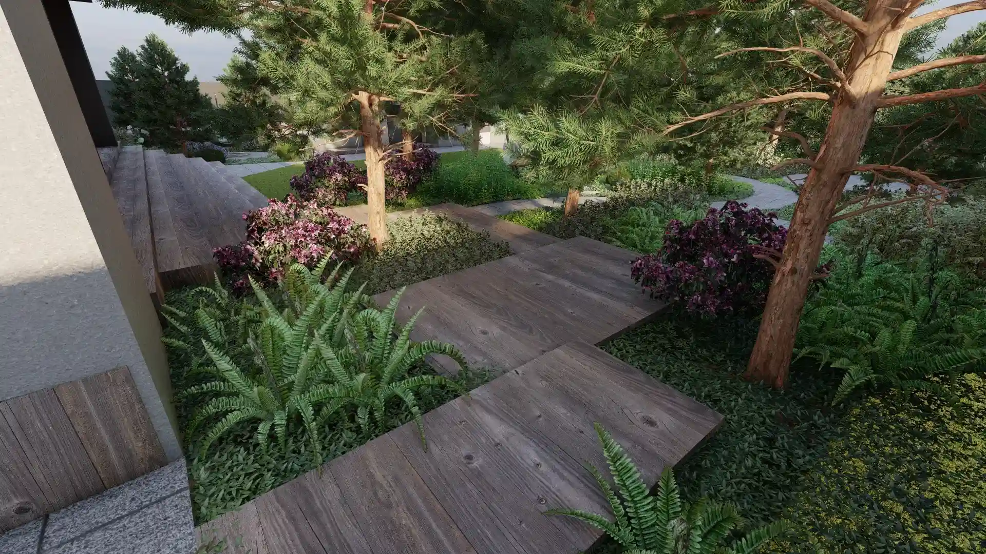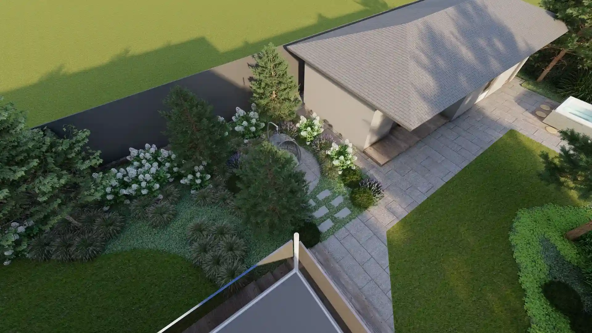 Проект в котором ЗD моделирование стало красивой рамкой для мощной работы по вертикальной планировке, ведь участок имеет перепад высоты в 1 метр в части заднего двора. Нам удалось найти решение, чтобы связать 3 важных элемента: отметка пола дома, баня и существующие замечательные сосны.