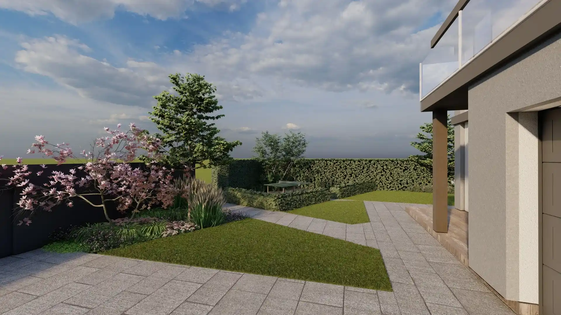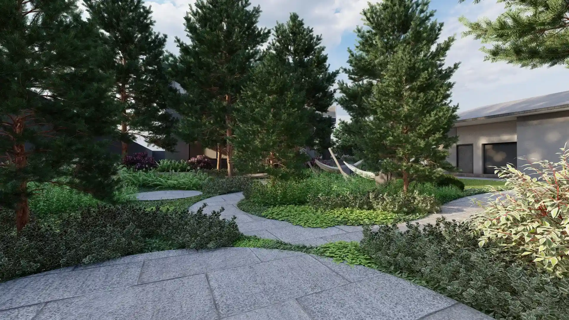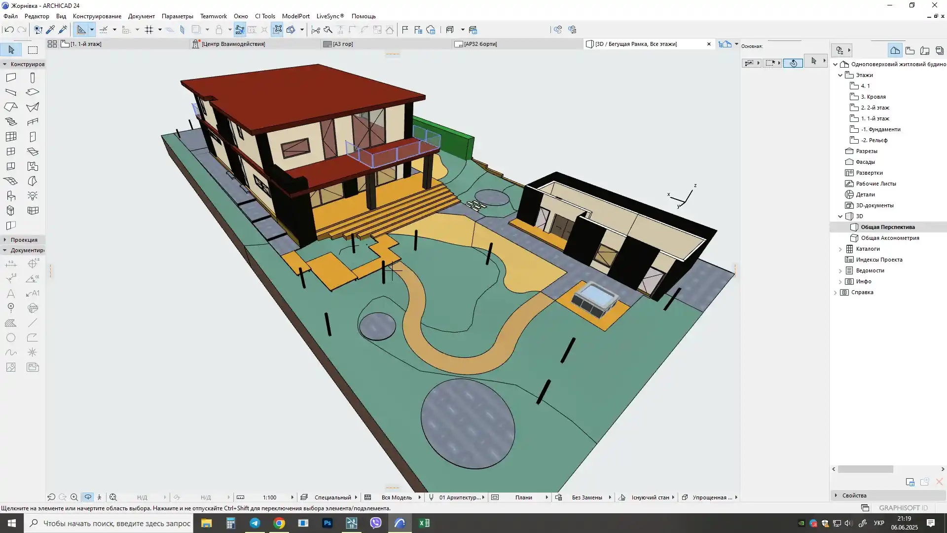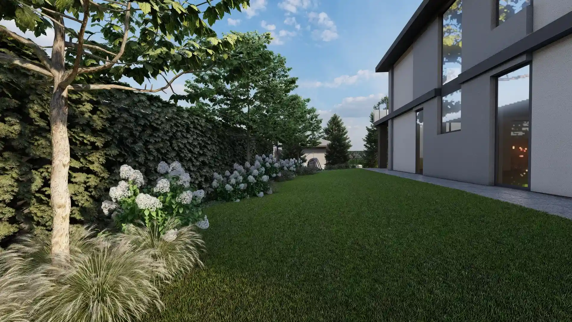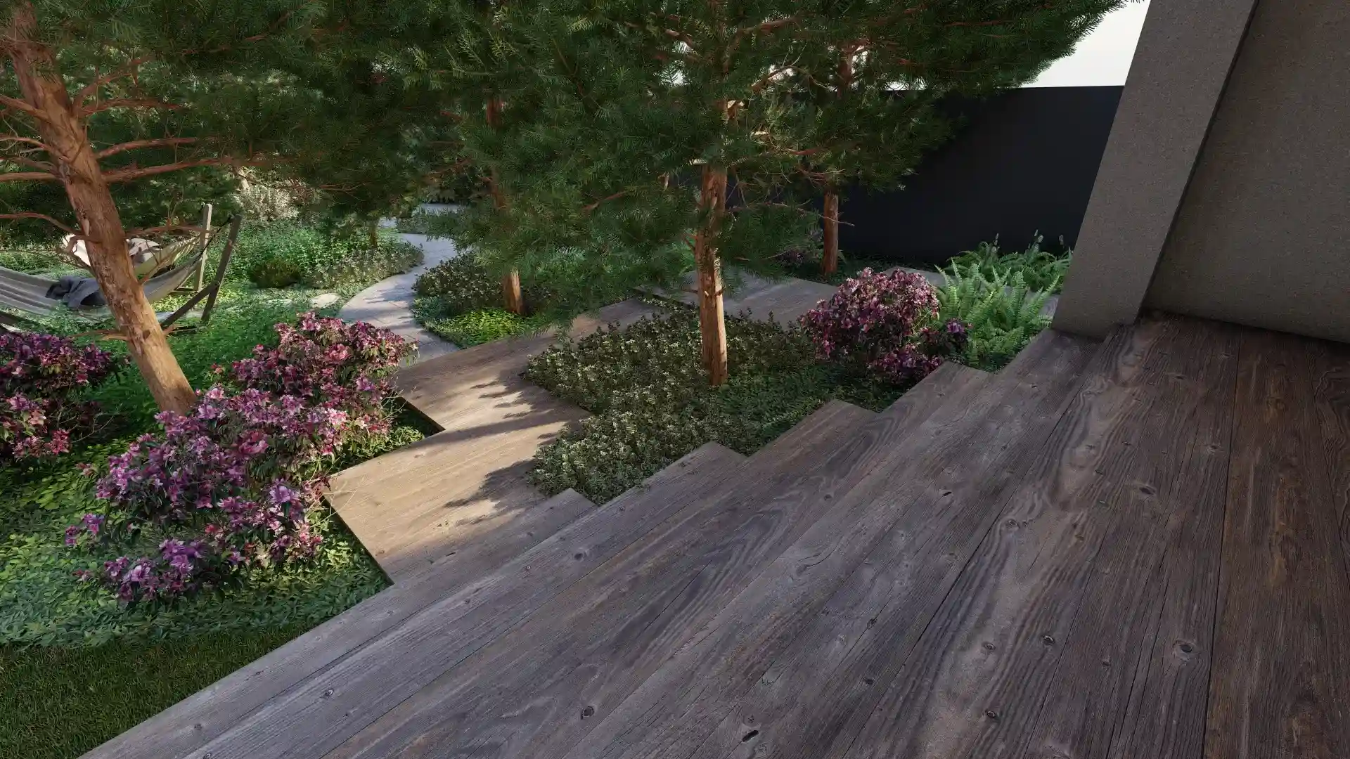 Проект в котором ЗD моделирование стало красивой рамкой для мощной работы по вертикальной планировке, ведь участок имеет перепад высоты в 1 метр в части заднего двора. Нам удалось найти решение, чтобы связать 3 важных элемента: отметка пола дома, баня и существующие замечательные сосны.